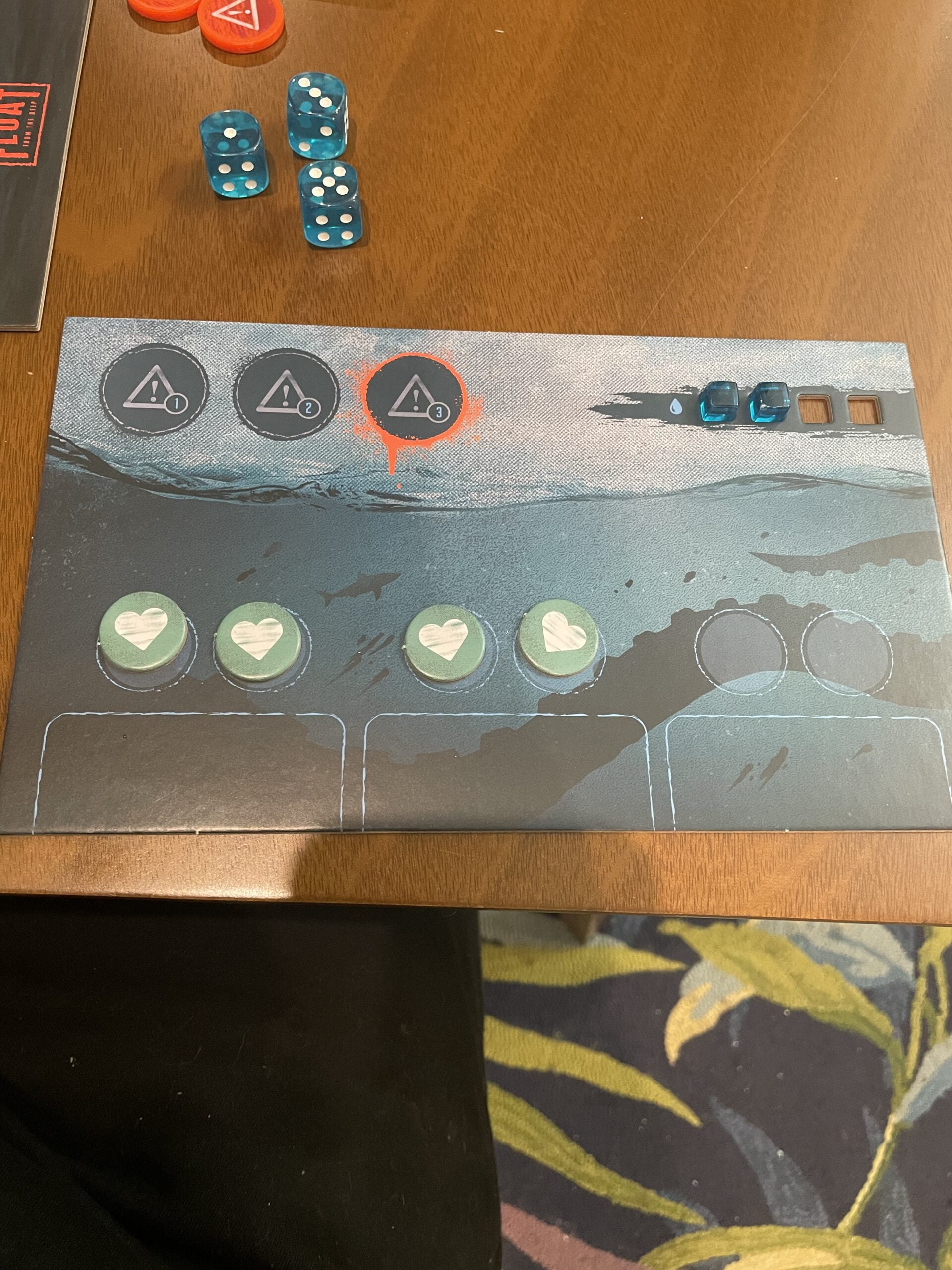 Each player also gets a station to monitor their crew status, health, and water. You’re also equipped with a danger meter determining if you must fight off the creature. At the end of the day, every player has to cough up their crew’s water rations and roll up to three dice to square up with the day’s aquatic demon.