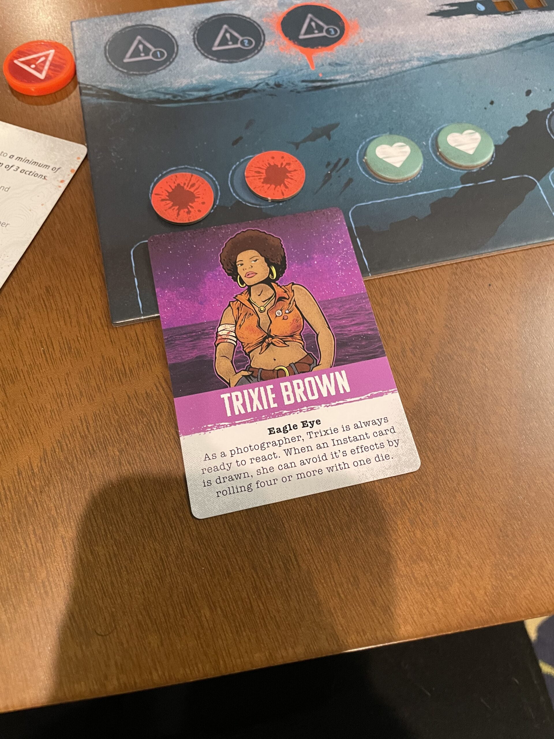 I played with my spouse James and fellow Horror Press Contributor Bash Ortega a few times. I played as “Eagle Eye” Trixie Brown, a no-nonsense photographer that reacts to situations quickly. She can avoid creature attacks if the player rolls four or more with one die.
