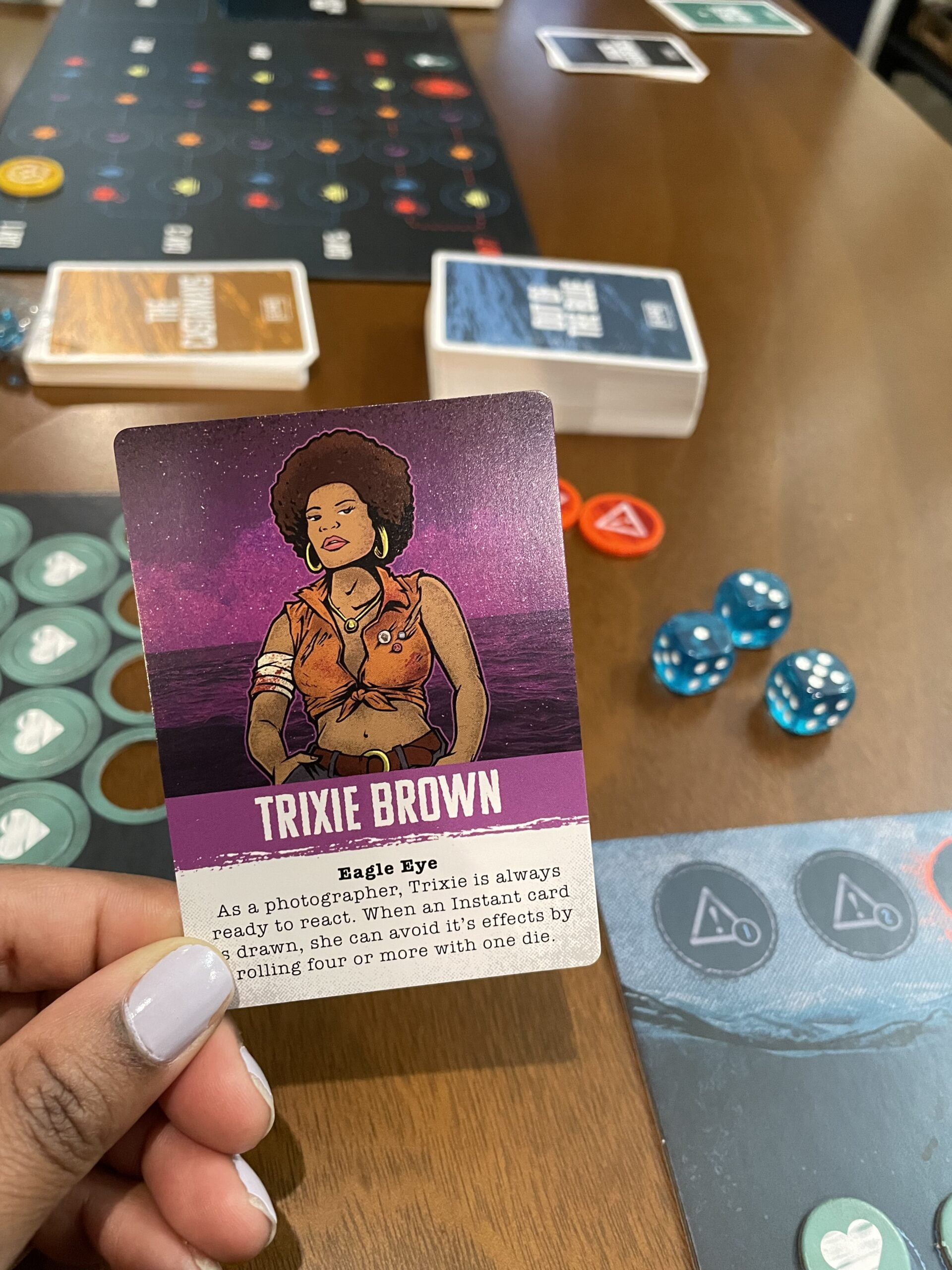 I played with my spouse James and fellow Horror Press Contributor Bash Ortega a few times. I played as “Eagle Eye” Trixie Brown, a no-nonsense photographer that reacts to situations quickly. She can avoid creature attacks if the player rolls four or more with one die.