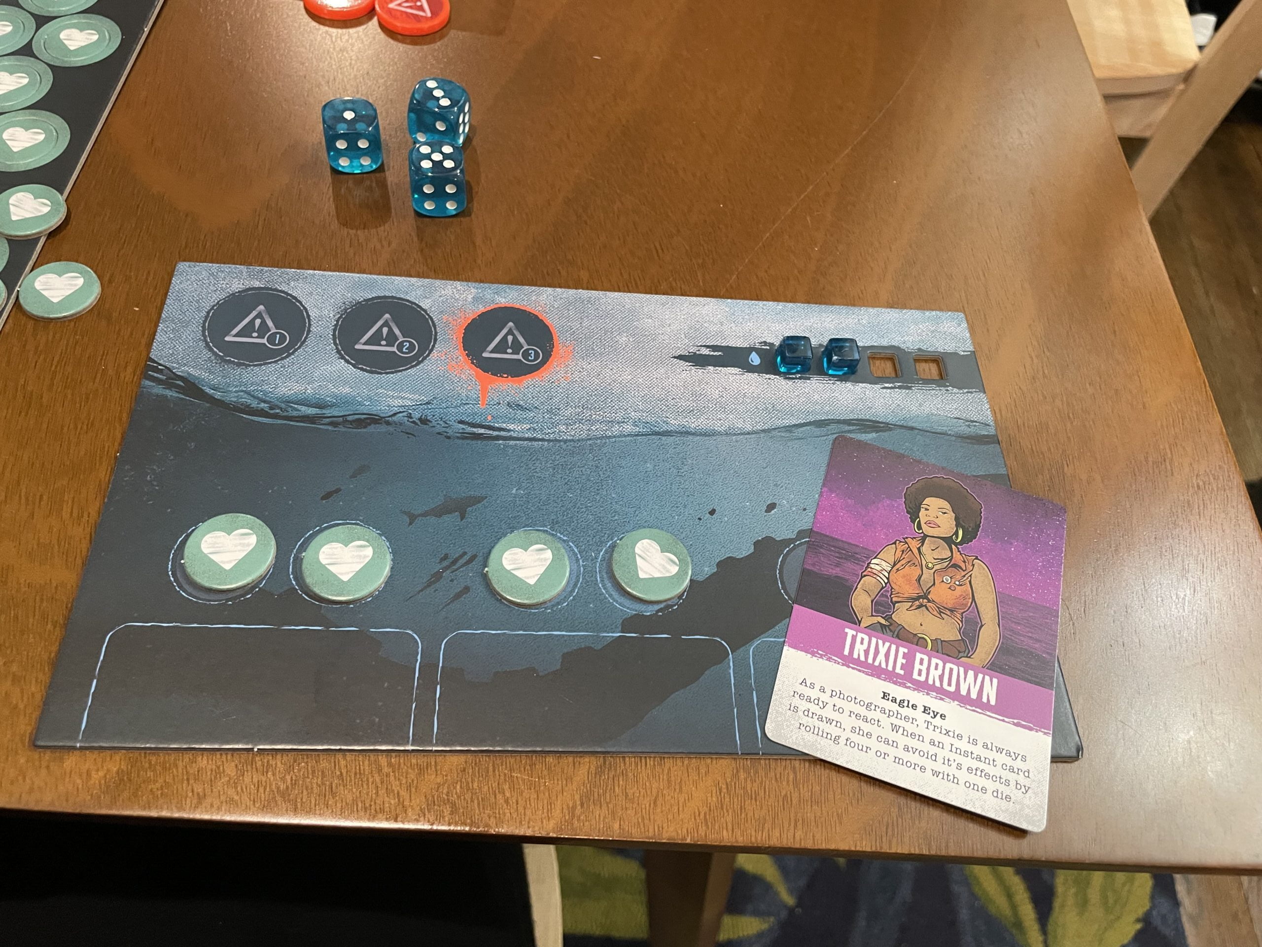 Each player also gets a station to monitor their crew status, health, and water. You’re also equipped with a danger meter determining if you must fight off the creature. At the end of the day, every player has to cough up their crew’s water rations and roll up to three dice to square up with the day’s aquatic demon.