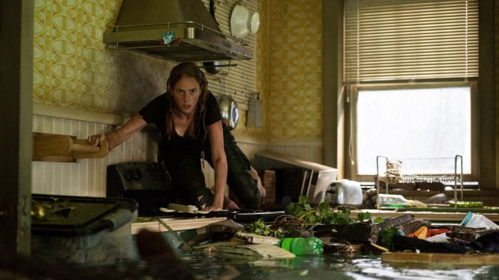 Here we have the story of college athlete and swimmer Haley (Kaya Scodelario), who goes to rescue her estranged father, Dave (Barry Pepper). Their banter is nice at times, but their strong suit throughout this film is being terrified and mauled by violent alligators who made their way through the storm drain.