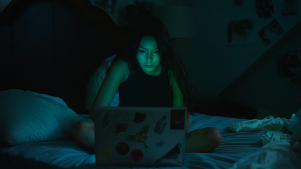 We see Rowan watching random videos, as she tries to distract herself from her own thoughts while she worries about her father. However, soon, cat videos aren’t doing it for her, and she starts to find extreme videos online. Things escalate to the point that she is watching self-harm videos and clips of people dying. This addiction begins to make it hard for her to connect with the people around her, including her new neighbor and love interest, Alex (Isadora Leiva).
